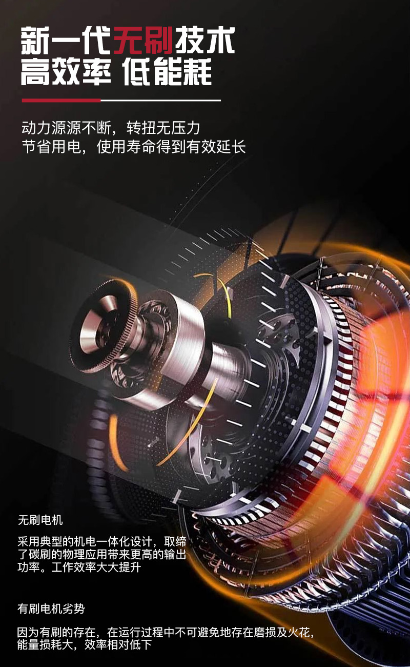 锂电无刷:无火花,不烧机,扭力强,转速高。无需更换碳刷,无需加油,维护方便。使用寿命20000小时左右。